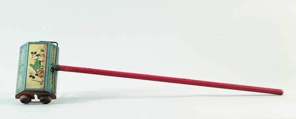 WALT DISNEY MICKEY MOUSE SWEEPER This great old lithographed tin sweeper depicts Mickey and Minnie making music on the piano. SIZE: Sweeper is 7-1/2″ w, shaft is 24″ l. CONDITION: Generally very good. A couple of small dents with very few minor rust spots. 1-628 (250-450) Auction: Advertising, Toy & Doll - Spring 2003 Please Note: All prices include the hammer price plus the buyer’s premium, which is paid by the buyer as part of the purchase price. The prices noted here after the auction are considered unofficial and do not become official until after the 46th day. |