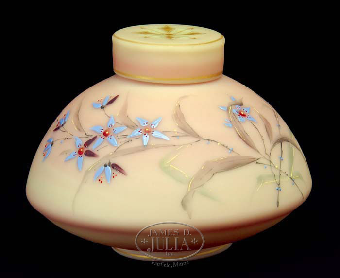 MT. WASHINGTON DECORATED BURMESE COVERED JAR Burmese glass with enamel decoration of blue flowers, green leaves and stems. Burmese lid has gold enameling. Retains Brookside Antiques paper label on underside. SIZE: 4-3/4″ dia x 4″ t. CONDITION: Very good to excellent. 5-64907 (1,000-1,500)