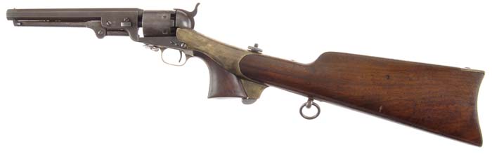 RARE COLT MODEL 1851 NAVY PERCUSSION REVOLVER. Cal. 36. SN 79476. Fine early navy with 7-1/2” bbl, pin front sight, 1-line Hartford address with dashes, 4-screw frame cut for shoulder stock with extended 4th screw. It has silver plated iron grip frame with small triggerguard and the rare feature of a swivel in front of the triggerguard. It has 1-pc walnut grip. Cyl & left side of bbl lug have British proofs. Accompanied by a matching numbered shoulder stock with brass furniture and uncheckered American walnut butt with a stud & swivel in bottom tang. This is a 3rd model navy with the rare small triggerguard and has 3rd type shoulder stock attachment. CONDITION: Very good to fine, all matching including wedge, except grips which are unnumbered. Overall the metal is a medium to dark silver/brown patina with some scattered, fine pitting. There are traces of case colors on the frame and hammer. Cyl has mostly fine pitting and retains 25-30% Ormsby naval battle scene. Mechanics are fine, strong bore with light to moderate pitting. Stock is sound with the brass having been slightly artificially aged and the stock retaining most of an old restored finish. 4-30619 JR305 (12,500-17,500)