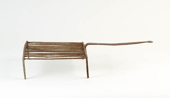 WROUGHT IRON FOOTED FIREPLACE GRILL. Hand forged with long handle and hanging hole. PROVENANCE: A 1940’s Monmouth Collection willed to the North Monmouth Church. SIZE: 3” h x 18-3/4” l x 10” w. CONDITION: Generally god. 9-95944 (100-200)