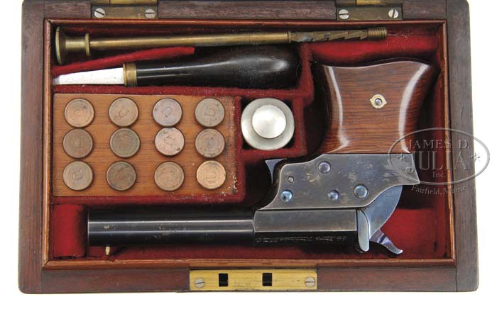 CASED REMINGTON NO. 3 VEST POCKET SAW HANDLE SINGLE SHOT DERRINGER. SN 4673. Cal. 41 RF. Blue finish with 4″ oct to rnd bbl, brass pin front sight and 2-line address on top flat. Left top flat is engraved “JAS. KERR & CO.” and the right top flat is engraved with that company’s address. Left flat of the bbl has British proofs. It has usual configuration and is mounted with 2-pc rosewood grips matching numbered in pencil inside each grip. Accompanied by its orig red velvet lined burl walnut casing with rnd medallion in the lid engraved “LONDON SCOTTISH GOLF CLUB / AUTUMN MEETING” around the perimeter and “WON BY / 1874” in the center. Obviously the individual who won this pistol did not have the case engraved with his name. Interior has a London Armoury / James Kerr & co. label inside the lid and bottom is compartmented for the derringer, a brass cleaning rod with jag, a small turnscrew, a Hawksley pewter oil bottle and a cartridge block containing twelve Remington 41 Rimfire cartridges. According to Flayderman’s Guide to Antique American Firearms there were about 15,000 or less of these derringers produced in the period 1865-1888 in two calibers. Few survive today and of those very few were ever cased. PROVENANCE: Herb Glass (1997); Robert Howard Estate Collection. CONDITION: Extremely fine plus, all matching including grips. Appears to be new & unfired with only minor flaking on each side of the frame and a few small spots on bottom of bbl; grips are sound with only one minor nick and retain about all of their orig bright varnish. Mechanics are crisp, brilliant shiny bore. Case is sound with a few minor nicks & scratches and retains virtually all of its orig varnish; interior is lightly faded & soiled with yellowed label; accessories are fine; ammunition has oxidized bullets and cartridges are difficult to remove from the block. 4-45372 JR73 (4,500-10,500)