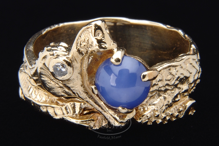 14KT GOLD & STAR SAPPHIRE RING. Very pretty 14kt yellow gold ring has stylized serpent design with single cut diamond in the eye and a 6.5mm star sapphire in the mouth. Sapphire has very prominent star and weighs approx. 1.25ct. SIZE: 7-1/2. CONDITION: Very good to excellent. 5-66007 (400-600)