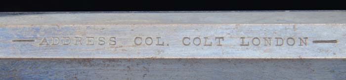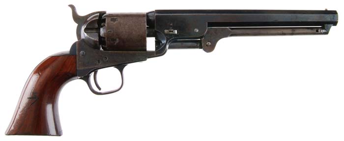 FINE COLT MODEL 1851 HARTFORD-LONDON NAVY REVOLVER. Cal. 36. SN 196211. Made in Hartford for the London market, blue & case colored with 7-1/2” oct bbl, brass cone front sight, London address on top flat with dashes at each end and British proofs on bbl flat & between nipples on cyl, which is without the Ormsby markings. It has a blued iron triggerguard & backstrap with 1-pc walnut grip with a large British acceptance arrow mark on right side. CONDITION: Very fine, all matching except properly unnumbered rammer handle. Bbl retains about 85% thinning, glossy, orig blue with a spot of rust on both sides, about 2” from muzzle. Cyl retains 15-20% thin orig blue with balance a medium brown patina and overall retains 70-75% Ormsby naval battle scene. Frame retains 75-80% orig case colors, stronger on right side with recoil shields mostly a medium to dark patina. Backstrap & buttstrap retain 75-80% thin orig blue and triggerguard about 60%, stronger around trigger, thin on front strap. Grip is sound with light edge wear, a few light nicks & scratches and retains about 95% orig varnish. Mechanics are fine, bright shiny bore with some moderate pitting. 4-30037 JR102 (4,000-6,000)
