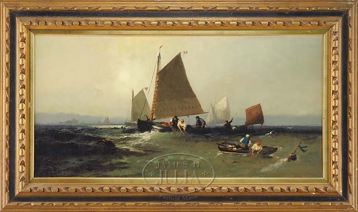 FRANKLIN DULLIN BRISCOE (American, 1844-1903) “ON THE FISHING BANKS”. Oil on canvas marine scene shows several fishing boats pulling in the nets. Several sails are seen on the horizon with the sun shining through fog. Signed lower left “JD Brisco 91”. Housed in a modern carved wood frame with gilt liner. SIZE: 18″ x 36″. PROVENANCE: Dr. Ladd Heldenbrand Estate, So. Portland, Maine. CONDITION: Relined, inpainting. Very good. 9-90903 (3,000-5,000)