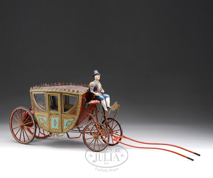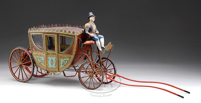 LARGE EARLY 1900’s TIN EUROPEAN CARRIAGE. Perhaps one of the most delicate, finely detailed, and hand enameled carriages ever produced during the first part of the 20th century! The tin body of the carriage itself is suspended by leather belts from an intricate framework, an extreme amount of hand painted decoration and fanciful tin work to the roof further add to the desirability of this rare toy. Purported to be of Spanish manufacture this toy has resided in a private collection for many years. The driver is of papier mache and appears also to be dressed in Spanish attire/uniform. Opening doors lead to the private compartment which has a fine sateen seat. This toy is without horse which probably would have been a hide covered horse on a wheeled wooden base or a tin/zinc combination horse with small wheels affixed to hooves. SIZE: 20″ l x 11″ h. CONDITION: Overall very fine original condition however some professional repairs were made to the undercarriage. The horse`s yoke is of newer manufacture. 1-8579 JL (5,000-7,000) Auction: Advertising, Toy & Doll - Spring 2008 Please Note: All prices include the hammer price plus the buyer’s premium, which is paid by the buyer as part of the purchase price. The prices noted here after the auction are considered unofficial and do not become official until after the 46th day. |