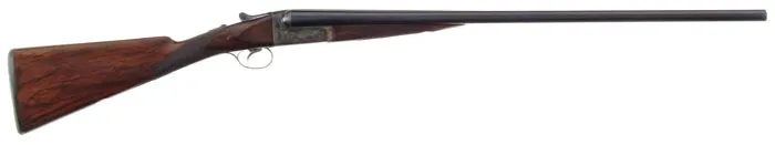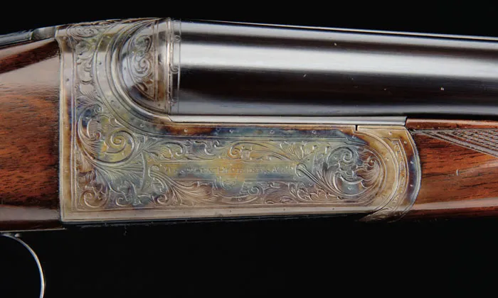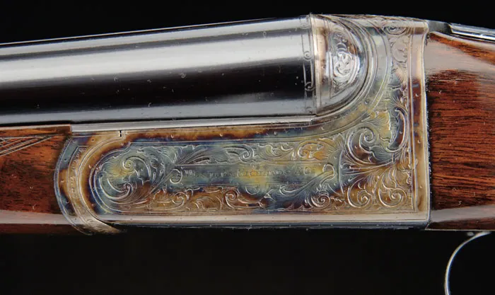 *WESTLEY RICHARDS BOXLOCK DROP ACTION DOUBLE BARREL SHOTGUN. Cal. 16 ga. SN 01084. Beautiful English double with 27-3/4” bbls choked FULL/MOD with tapered, concave, smooth rib with sgl bead, ejectors, dbl under bites & third fastener. It has a sgl selective trigger. Mounted with very nicely figured, checkered, streaky English walnut with black horn-tipped splinter forearm and straight stock, 14-1/4” over a thin, Old English pad. Bottom of stock has a silver initial plate engraved “JFF”. Receiver & appended iron are very beautifully engraved in intertwined, foliate & floral arabesque patterns. Maker’s name is in a panel on each side. Fences have a narrow raised rib around their back edges. Bore diameter: left – .664, right – .661. Bore restrictions: left – .027, right – .003. Wall thickness: left – .038, right – .035. Drop at heel: 2-1/4”, drop at comb: 1-1/2”. Weight: 6 lbs. .26 oz. CONDITION: Extremely fine, as professionally restored. Bbls retain most of a fine English style bright blue and receiver virtually all of its brilliant case colors. Floorplate has a small scrape from forend iron, otherwise it and trigger guard retain virtually all of their bright blue. Wood is sound with minor handling & use marks and retains virtually all of its beautiful professionally restored finish. Mechanics are crisp, brilliant shiny bores. 4-58373 JR449 (9,000-12,000)