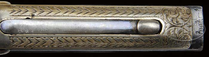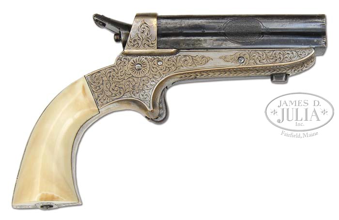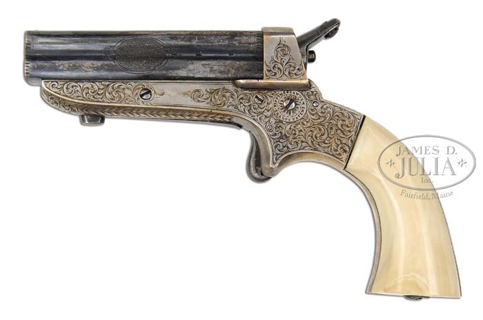 RARE CASED ENGRAVED LARGE FRAME TIPPING & LAWDEN MODEL T3 SHARPS PATENT 4-BARREL DERRINGER. SN 5234. Cal. About 340. Blue & silver finish with 3-15/16″ 4-shot bbl cluster with British proofs, mounted on a silver plated brass frame with 2-pc smooth ivory grips. It has a bar-shaped bbl release and spur trigger. Pistol is engraved in fine, well-executed foliate arabesque patterns with about 75% coverage. Front bottom of frame & backstrap are engraved in feather patterns. Buttstrap & grip retainer are engraved in foliate arabesque patterns. Bbl has a hand stippled oval panel on each side which serves as a grasping area for opening. Accompanied by an orig brown velvet lined mahogany casing compartmented in bottom for the pistol & an all metal cleaning rod with integral jag. There is an empty covered compartment. According to Sharps Firearms, Sellers, only about 250 of these derringers were produced. PROVENANCE: Jackson Arms (1978); Robert Howard Estate Collection. CONDITION: Very fine. Bbls retain 70-75% strong orig blue with the loss areas a light patina. Frame retains about 85-90% orig silver with dark case colors on the hammer and faded blue on bbl latch. Grips are extremely fine with a couple of small age lines and retain a wonderful mellow ivory patina. Mechanics are fine, bright shiny bores. Case has a couple of small grain checks in bottom, otherwise is sound with light handling & storage marks and retains most of its orig varnish. Interior is moderately to heavily faded with moderate soil & wear and damage from the front sight & hammer spur. Cleaning rod is fine. 4-45368 JR62 (4,000-6,500)