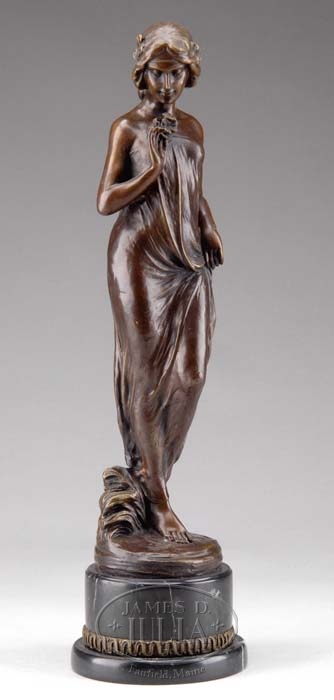 UNSIGNED (Mid 20th Century) FIGURE OF A CLASSICALLY ROBED WOMAN. Bronze in a demure pose with flowing robe, bouquet of flowers in right hand and in her hair on a naturalistic circular base, mounted on a round black marble plinth. SIZE: 21″ h. CONDITION: Very good original patina, a scratch on left proper arm. 9-74603 (500-700)