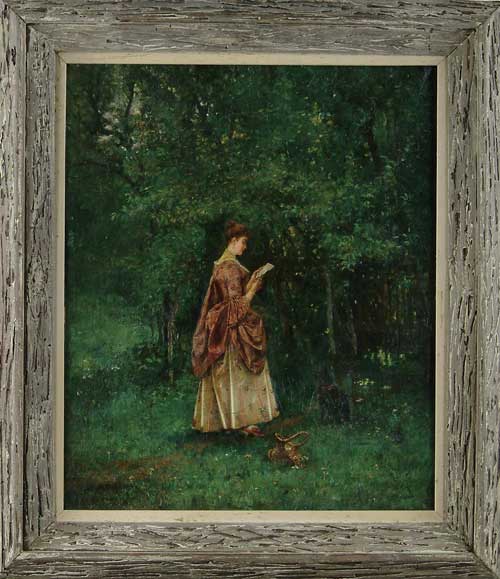 ATTRIBUTED TO GEORGE HENRY BOUGHTON (American, 1833-1905) THE LOVE LETTER. Oil on canvas scene shows fancy dressed woman standing amongst grass and wild flower covered ground with woods as a background. She reads a letter, which is held in both hands. Her basket of flowers is seen tipped on its side at her feet. Signed lower left illegibly. Housed in a naturalistic carved and painted wood frame with white liner. SIZE: 24” x 20”. CONDITION: Craquelure, very good. 9-98985 (1,000-1,500)