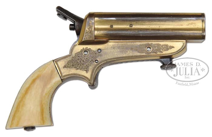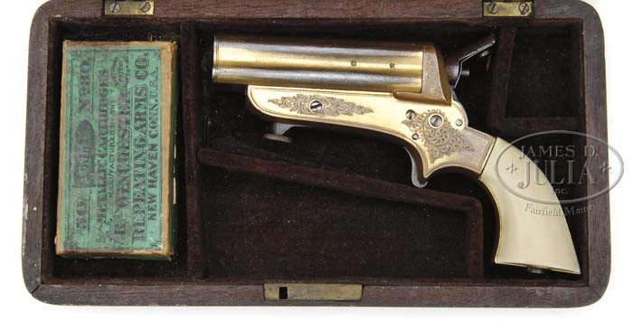CASED ENGRAVED FOREIGN COPY OF A SHARPS DERRINGER. SN NSN. Cal. 30 RF. Gold finish. Possibly a Model T3 by Tipping & Lawden made by C.H.W. Sandmann as pictured in Sharps Firearms, Sellers. Pistol has 3-1/8″ 4-bbl cluster with pin front sight and British proofs on each side. Frame is flat-sided with rounded standing breech and spur trigger, mounted with 2-pc smooth ivory grips. Pistol is nicely engraved in English style foliate arabesque patterns on sides of frame & standing breech. Frame has a dbl border outline and backstrap is engraved in a braided rope pattern. Buttstrap & grip keeper are engraved in foliate arabesque patterns. Accompanied by its orig purple velvet lined mahogany casing compartmented in bottom for the pistol, a box of Winchester 30 RF cartridges containing 49 rds with two other empty compartments. PROVENANCE: Robert Howard Estate Collection. CONDITION: Fine. Bbl cluster retains 65-70% gold wash mostly in the flutes and around front & rear edges; frame retains about 75% strong gold wash with exposed brass on front & backstraps which is a dark mustard patina; grips are sound with a wonderful ivory patina. Mechanics are fine, bright shiny bores. Case has a couple of grain checks in bottom, otherwise is sound with light handling & storage nicks & scratches and retains most of an old restored finish; interior is moderately faded & soiled with oxidation from cartridges in the large compartment and has two loose partitions; cartridge box has four open corners with moderate soil; cartridges are heavily oxidized. 4-45322 JR82 (3,000-6,000)