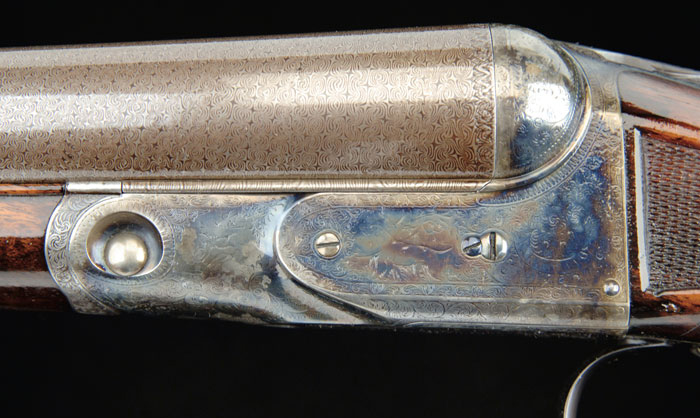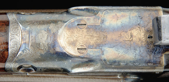 GOUGH ENGRAVED PARKER AH GRADE DAMASCUS DOUBLE BARREL SHOTGUN. Cal. 10 ga. SN 62222. Built on a No. 3 frame with 32” very fine pattern, Damascus steel bbls with tapered, concave, matted rib, sgl bead, doll’s head rib extension, extractor & dbl triggers. Mounted with very highly figured, streaky, marble cake, French or Circassian walnut with checkered splinter forearm & Prince of Wales stock with checkered, raised, fleur-de-lis side panels, 14” over a checkered skeleton buttplate. Receiver is very nicely engraved by Gough with the vignettes of two pointers on left side with four pheasants on forward panel, two setters on right side and five flying ducks in forward panel. Bottom has the large vignette of two setters on point with five partridge and bottom front has the small vignette of a running deer. Gough’s signature appears below the leg of the setter nearest the trigger bow. Trigger bow has two setters on point. Fences have a sgl raised rib around rear edge. This shotgun is in a feature article in the Summer 2006 issue of Double Gun Journal. Bore diameter: left – .797, right – .808. Bore restrictions: left – .031, right – .038. Wall thickness: left – .045, right – .038. Drop at heel: 2-3/4”, drop at comb: 1-11/16”. Weight: 9 lbs. 14.4 oz. Included is the Spring issue of the Double Gun Journal regarding this gun. CONDITION: Very fine. Overall retains about all of a beautiful, professionally restored finish. Bbls have bright brown Damascus pattern & receiver brilliant case colors. Stock has a repaired chip back of top tang, otherwise wood is sound and retains a bright clean professional finish. Mechanics are crisp, brilliant shiny bores. 4-59228 JR451 (7,500-12,500)