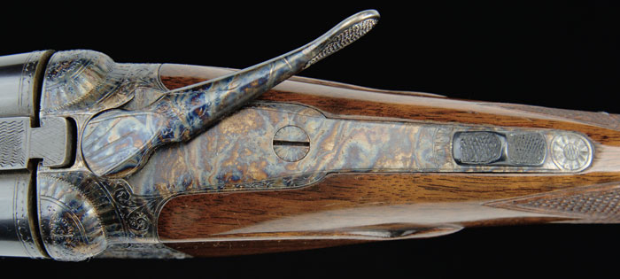 *PARKER DH GRADE DOUBLE BARREL SHOTGUN. Cal. 28 ga. SN 191344. Built on a “OO” frame with 25-1/2” Titanic Steel bbls choked CYL/CYL and appear to be orig length. It has tapered, concave, matted rib with dbl ivory beads, doll’s head rib extension, extractor & dbl triggers. Mounted with replacement, center feather crotch cut, American walnut with checkered, splinter forearm & straight stock with raised, teardrop side panels, 14-1/2” over a checkered, skeleton buttplate. Bottom tang channel is stamped with serial number and “LDG” with date “12.8.80”. Presumably this stands for Larry DelGrego, having restocked this shotgun in 1980. Receiver is engraved in typical “D” patterns with a setter on left side, a pointer on right side & four pheasants on floorplate, surrounded by foliate arabesque patterns and maker’s name on each side. Water table has lightning cuts. Bore diameter: left – .554, right – .553. Bore restrictions: left – .003, right – .003. Wall thickness: left – .023, right – .025. Drop at heel: 2-7/16”, drop at comb: 1-1/2”. Weight: 5 lbs. 8.96 oz. CONDITION: Very fine. As completely DelGrego restored. Bbls retain about all of a fine rust blue and receiver all of its bright case colors. Wood is sound and retains all of its custom finish. Mechanics are fine, bright shiny bores with a spot or two of pitting. Bores have been honed. 4-59274 JR695 (12,500-17,500)
