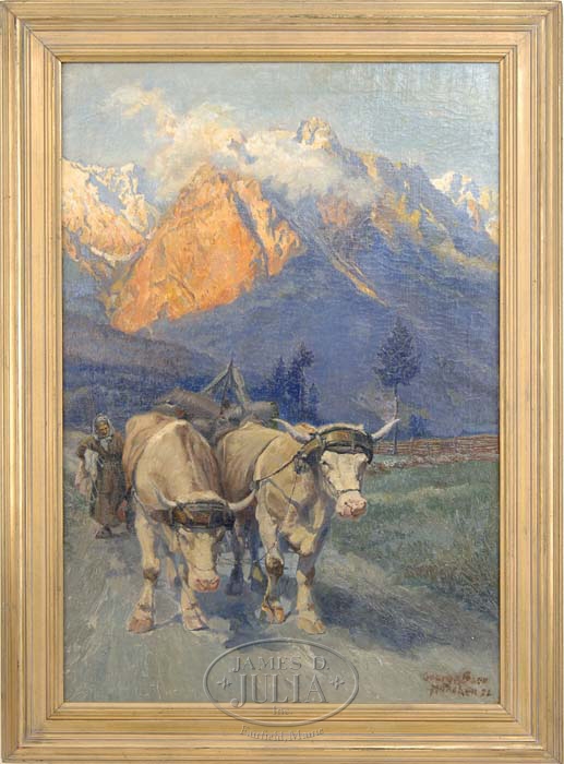 GEORGE BAER (American, 1895-1971) THE JOURNEY HOME. Oil on canvas Alpine scene shows a two oxen team pulling laden cart with old woman beside. A fenced pasture and road are seen in foreground with tall sun drenched snow covered mountain peaks in background. Signed lower right “George Baer, Munchen”. Housed in a fine old gilt molded wood frame. SIZE: 38” x 25-3/4”. CONDITION: Very good, relined with craquelure. 9-70869 (6,000-10,000)