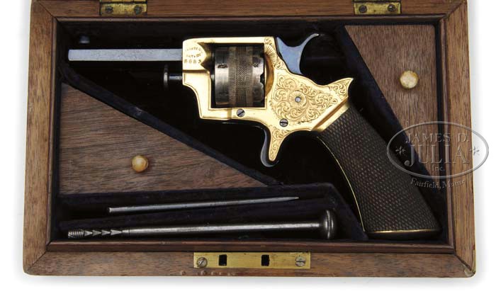 RARE CASED ENGRAVED TRANTER SMALL FRAME SPUR TRIGGER REVOLVER. SN 51. Cal. 22 Short. Blue & gold finish with 2-1/2″ oct bbl, tiny blade front sight engraved on top flat with the distributor’s name “C. GOLDEN, BRADFORD”. Frame & grip frame are heavy gold plated with the manufacturer’s name & patent information on left front side. Frame is very nicely engraved in foliate arabesque patterns with a rosette on each side around hammer screw. Hammer & trigger are fire blued. Cyl is 7-shots, silver-plated with triple knurled decoration around center. Mounted with 2-pc, full checkered walnut grips matching numbered to this revolver. Buttcap is smooth steel also matching numbered with an engraved rosette around screw hole. All screws are fire blued. Accompanied by its orig English style highly figured burl walnut casing with empty silver shield in lid. Interior is purple velvet lined and compartmented for the revolver, an L-shaped screwdriver and an all metal cleaning rod with jag. Two wood covered compartments are empty. Few of these well made little revolvers were produced by the Tranter Co. and are rarely found today in any condition. It is indeed rare to encounter one so nicely engraved and with exhibition finish. PROVENANCE: Tom Wibberly (1985); Robert Howard Estate Collection. CONDITION: Extremely fine plus, all matching including bbl, cyl, grips & grip cap; even the cyl pin is matching numbered. Overall retains virtually all of its orig factory finish with glossy bright blue & brilliant gold; cyl retains virtually all of its orig silver; grips are sound showing light diamond point wear. Mechanics are crisp, brilliant shiny bore; revolver appears to be unfired however it has been handled and dry fired with firing pin marks on rear face of cyl. Case has slight separation in the lid, otherwise is sound with usual storage & handling nicks, dings & scratches and retains most of its orig varnish; interior is lightly soiled with crisp purple color. 4-45320 JR79 (3,000-5,000)