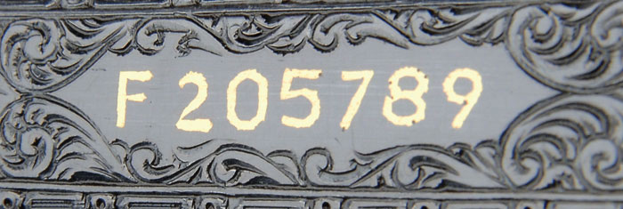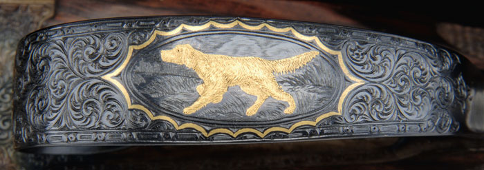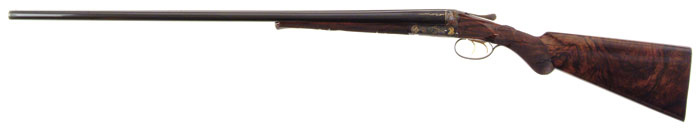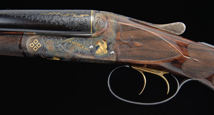 *CASED SPECTACULAR CONNECTICUT SHOTGUN MFG. CO. FOX FE SPECIAL GRADE DBL BBL SHOTGUN. Cal. 20 ga. SN F205789. Fabulous C.S. Mfg. Co. shotgun with 30” bbls choked FULL/MOD with tapered concave matted rib, dbl ivory beads, crossbolt rib extension, ejectors & gold plated dbl triggers. Right bbl is inlaid in gold “MADE TO ORDER A.H. FOX” and left bbl “KRUPP FLUID STEEL”. There are narrow gold bands at muzzle & chamber ends with a gold band on rib and gold lightning bolts on sides of chambers. Bbl flats are inlaid in gold “FE SPECIAL / F205789”. Mounted with extraordinarily beautiful, marblecake, burl, honey & chocolate circassian walnut with fleur-de-lis carved & checkered, black insert, schnable tipped forearm & carved & checkered rnd knob pistol grip stock, 14-5/8” over a checkered & carved butt. Receiver & appended metal are all fantastically engraved by “J.R. Demunck” & signed on trigger plate. It has full coverage, extremely fine, foliate arabesque patterns with extremely well executed gold woodcock on left side, gold partridge on right side, gold pheasant on bottom front of receiver & a gold setter on trigger bow. Each side of receiver has maker’s name in gold & each end of hinge pin & thumb lever pivot have four gold diamonds. Floorplate screw & trigger guard vignette have scalloped gold wire borders. Top tang has “SAFE” in gold & serial number on bottom tang is in gold. Water table has serial number & “FE SPECIAL” in gold. Water table also has very beautiful engraving patterns. Accompanied by a C.S. Mfg. Co., maroon felt lined, leather trunk case with label in lid & compartmented in bottom for a 2-pc brass & wood cleaning rod & square oil bottle. Also has its orig canvas & leather cover with a broken zipper. Bore diameter: left – .622, right – .621. Bore restrictions: left – .024, right – .013. Wall thickness: left – .037, right – .034. Drop at heel: 2-1/2”, drop at comb: 1-1/2”. Weight: 5 lbs. 14.72 oz. CONDITION: Extraordinarily fine, as new, may have been fired but if so, very little, although it has been assembled a number of times as there are ejector scrape marks on standing breech. Bbls have brilliant bright blue & receiver vivid case colors. Wood has beautiful high gloss, orig factory finish with only one or two minor flaws mostly around edges of butt. Case is equally new. 4-59204 JR319 (20,000-30,000)