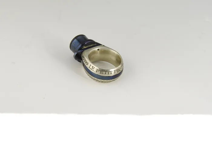 CASED “LE PETIT PROTECTOR” RING/ PISTOL. SN NSN. Cal. 4mm Pinfire. Finely made and finished 6-shot finger ring of unique design, with pivoting hammer on one side, main spring wrapping around German silver finger loop, and with trigger that extends into firing position when cocked. 6-Shot revolving cylinder has spring detent bolt, and is manually rotated with knurled bead at top of cylinder. Cylinder is loaded by removal from the ring, and retained by a screw. Steel parts are niter blued. spring steel parts are temper blued, and body of ring is of polished German silver, and is engraved “Le Petit Protector” with acanthus engraved embellishments either side, and around off-side of ring. Ring is contained in its original reddish brown clamshell leather case with German silver oval inset into top of lid, engraved “Le Petit Protector”. Interior is lined with purple velvet, with French fitted compartments for ring, screwdriver, and 6 pinfire cartridges, 5 of which are present. Interior of lid is embossed with “J. Hinds, Watchmaker and Jeweler 33 St. John’s Rd. Clapham Junction” on silk lining. Mr. Howard’s notes indicate that he acquired this pistol in 2000 from O. C. Young. PROVENANCE: Robert Howard Estate Collection. CONDITION: Excellent, near new. Steel parts retain nearly all their orig bright blue. Cylinder has some very minor marks from being rotated. German silver ring retains nearly all its orig polish. Case leather is slightly chipped, with a few marks. Interior is excellent. Cartridges are glued into place and not removable. Gold embossing on lid liner is flaking slightly, but is clear. A beautifully made and intriguing little “gem”. 4-45269 MGM76 (3,000-6,000)