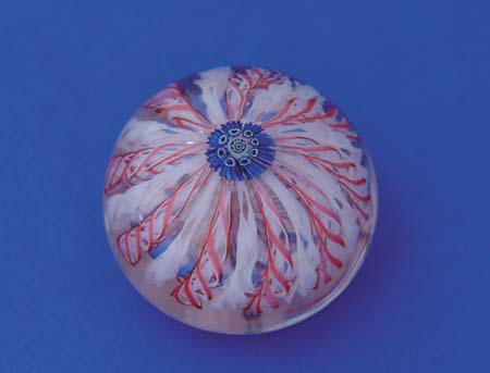 NEW ENGLAND GLASS CO. CROWN PAPERWEIGHT. A central blue and white complex millefiori cane rests atop a crown of red and white twisted filigree. SIZE: 2-1/2” dia. CONDITION: Numerous chips and scratches to base, minor roughage on top surface. 5-69123 (800-1,200)