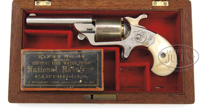 SCARCE CASED ENGRAVED NATIONAL ARMS MOORE’S PATENT SPUR TRIGGER REVOLVER. SN 30320. Cal. 32 Teatfire. Nickel & gold finish with 3-1/4″ rnd bbl, half moon front sight and National Arms 1-line bbl address. It has 6-shot unfluted cyl and is mounted with 2-pc birdhead ivory grips. Frame is lightly engraved in New York style with foliate arabesque patterns with foliate sprays on recoil shields and breech end of bbl. Bbl, frame & ejector are nickel plated. Cyl & hammer are gold washed. Accompanied by its orig red felt lined mahogany casing compartmented in the bottom for the revolver and an extremely rare full box of 32 Teatfire cartridges with black & gold label on an orange box with green band. According to Flayderman’s Guide to Antique American Firearms there was a total of approx. 7,000 of these National Arms marked revolvers with hook extractor produced. PROVENANCE: Allen Thompson (1982);Robert Howard Estate Collection. CONDITION: Extremely fine plus, all matching, probably unfired. Bbl & frame retain just about all of their strong orig nickel finish with only one small spot of loss on left side of frame; cyl & hammer retain most of their light gold wash with a couple of small thin spots on cyl; grips are sound with wonderful mellow ivory patina. Mechanics are crisp, brilliant shiny bore, probably unfired. Case has a crack in bottom with light handling & storage marks and retains most of its orig varnish; interior is lightly faded with minor soil in bottom; cartridge box is very fine with light wear on label and light soil on box body & band; cartridges are fine with lightly oxidized bullets; four loose cartridges are also fine. 4-45355 JR74 (3,000-5,000)