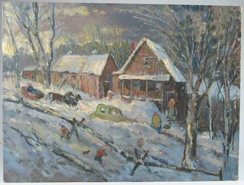 F.W. PROCTOR (American, 20th Century) AFTER THE SNOW. Oil on board scene shows a house with connected barns after a recent snow storm being visited by people coming out of a light green car and another visitor arriving by a red sleigh pulled by two horses. Two children appear to be having a snowball fight with small animal between. Unframed. Signed on back “F W Proctor Dover Plains, N.Y.”. SIZE: 18” x 24”. CONDITION: Very good. 9-98482 (400-800)