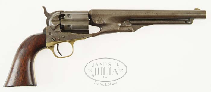 RARE COLT MODEL 1860 FLUTED ARMY PERCUSSION REVOLVER. Cal. 44. SN 6758. Fine early army with 8″ rnd bbl, German silver front sight & 4-screw frame with flat headed hammer screw, cut for shoulder stock. It has a full fluted cylinder with patent marking in one of flutes & serial number on back between nipples. It has brass trigger guard & iron backstrap with 2-pc walnut grips. Only about 4,000 of these fluted armies were ever made & it is well known that a number of them were shipped to the Confederacy just prior to the outbreak of hostilities of the Civil War. CONDITION: Fine, all matching including wedge. Bbl retains traces of orig finish in sheltered areas & traces of case colors on loading lever handle. There are a couple of small spots of pitting on left side of bbl & a few small dings around wedge slot. Frame retains traces of case colors in very sheltered areas with balance turned silver. There are some small dings on edge below cylinder. Trigger guard & front strap are a lemon yellow patina while backstrap & buttstrap retain about 50% thin orig blue which may be a factory restored finish. Will not hold at half cock, otherwise mechanics are crisp with all six safety pins prominent. Grips have good edges with light handling & use marks & a few chips on edges & retain about 50% orig varnish. Bright shiny bore with a few scattered small spots of pitting. 4-56526 JR217 (3,000-5,000)