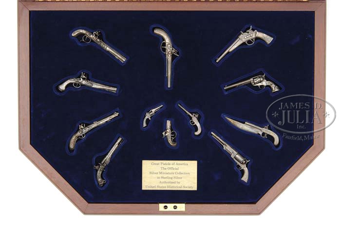 SET OF REPLICA STERLING SILVER MINIATURE PISTOLS AND REVOLVERS (SET OF 12) IN DISPLAY CASE. SN NSN. U. S. Historical Society series of the “Great Pistols of America”. Each pistol is individually crafted of silver with numerous moving parts, and most are stamped “sterling”. Set includes Kentucky pistol, derringer, Elgin cutlass pistol, Colt single action, etc. in walnut display case. Pistols are French fitted in blue velvet with literature describing each pistol and its significance. Key is included. PROVENANCE: Robert Howard Estate Collection. CONDITION: Excellent, except as noted … silver is pleasingly toned. Kentucky pistol is missing its ramrod. Single action army is missing its cylinder retaining pin. Each replica cost $200.00 in 1982. 4-45468 MGM128 (1,000-1,500)