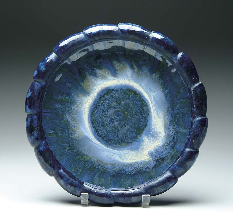 FULPER SHALLOW BOWL. This large shallow ribbed-sided bowl with strong blue decoration on the base with shaded and variegated blues and greens on the top and on the inside. A particularly attractive decoration. A faint tall impressed “Fulper” signature on underside. SIZE: 13-1/2 in. dia x 2-1/2 in. t. CONDITION: Very good. 5-61512 (450-750)