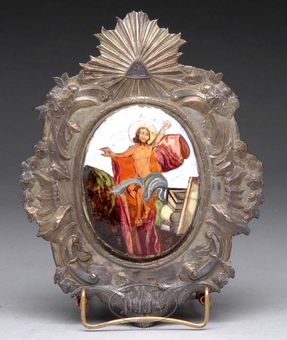 SOUTH AMERICAN ENAMELED ICON WITHIN A HAMMERED AND CHASED SILVERED METAL FRAME 19th Century. The oval enameled plaque depicting haloed Christ rising from the tomb, polychrome painted. Mounted in a conforming and scrolled floral molded frame headed by a sunburst. Indistinct hallmarks along frame base. SIZE: 7-1/4”h x 5-3/4”w. CONDITION: Overall good with minor wear to paint, frame with some creasing. 9-74607 (250-400)