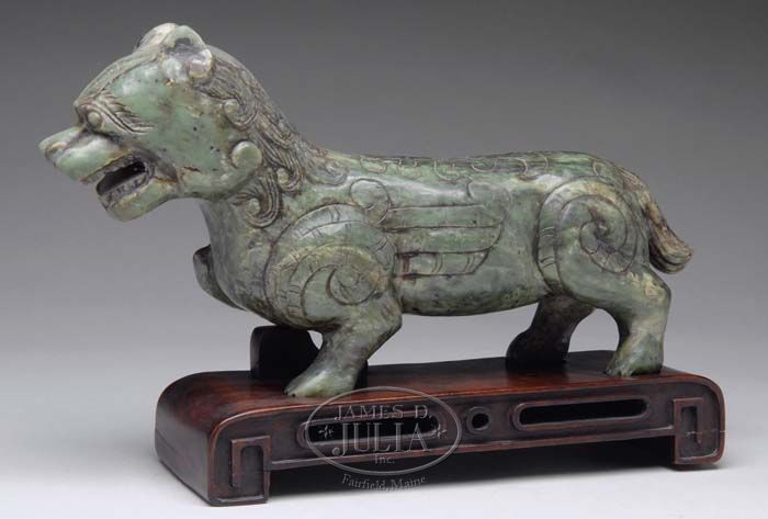 ORIENTAL CARVED JADE FIGURE OF A FANCIFUL WINGED CANINE. Depicted in an alert pose, right front paw raised with incised wings and flowing mane, baring teeth and mounted on a carved teak stand. PROVENANCE: Fine private Long Island, New York mansion. SIZE: Overall 9-1/2” h x 14-3/4” l 4” w. CONDITION: Minor chip/fracture to proper right ear tip, otherwise very good. 9-74998 SM (1,000-2,000)