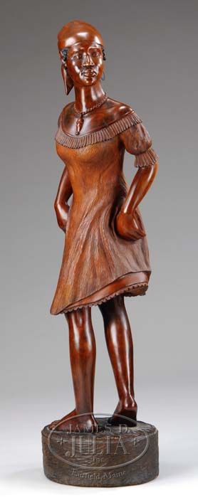 CARVED WOODEN STATUE OF A HAITIAN SLAVE GIRL, SIGNED “LE DECIMUS HAITI”. Depicting a young girl with head scarf and hoop earrings wearing a beaded necklace and frock, hands on hips, posing barefoot on a circular lined plinth. Carved from the solid. SIZE: 54-1/2” CONDITION: Very good overall with original surfaces, missing an earring. 9-90308 SM (1,500-2,500)
