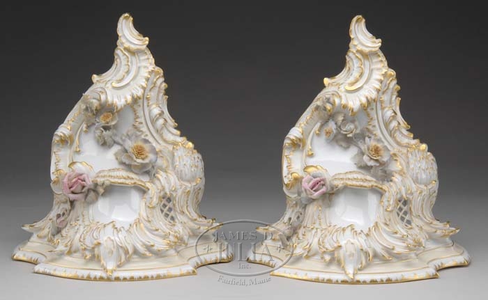 PAIR OF SEVRES STYLE ROCOCO PORCELAIN WALL BRACKETS. Late 19th Century. Each shaped shelf above the bracket molded with acanthus leaftips and C and S-scrolled elements and a scallop shell, the central cartouche with applied floral decoration, the whole gilt heightened. Each marked with an underglaze blue torch beneath an overglazed “KPM” beneath a crossed globe mark. SIZE: 11-3/4”h x 10-1/4”l x 7-1/2”d. CONDITION: Overall very good condition. Losses to one flower petal on each bracket. 9-74640 (800-1,000)