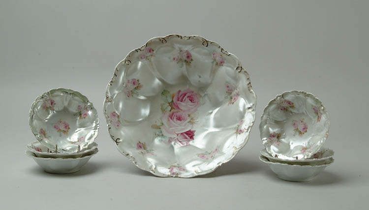 ROYAL BAYREUTH BERRY SET. Set consists of a large bowl and six smaller bowls. Decoration is of pink roses. SIZE: Large bowl 10″ diameter. Smaller bowls 5″ diameter. CONDITION: One of the smaller bowls has a very minor flake, otherwise very good to excellent. 5-67045 (300-500)