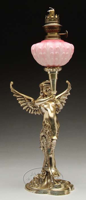 OUTSTANDING FIGURAL OIL LAMP. Pink satin glass peg lamp font in ribbed and leaf molded design has attached burner. Lamp fits into a torch held by both hands of a winged mermaid on a shaped flower decorated base. Base figure silver plated and very nicely cast. SIZE: 18” h to top of burner x 7” w. CONDITION: Very good. 9-71264 (600-1,000)