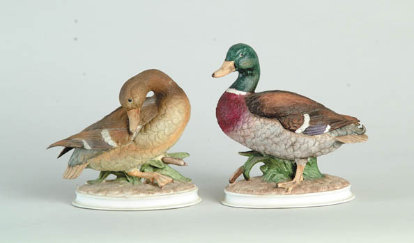 PAIR OF PORCELAIN DUCK FIGURINES. 20th Century. Male and female mallard. SIZE: 6-1/2” h x 6” l. CONDITION: Good. 9-94546 (100-200)