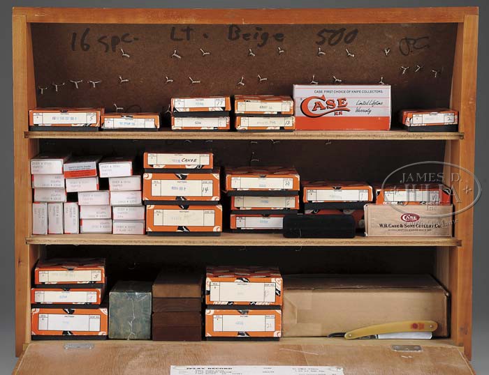 LOT OF ABOUT 79 CASE CUTLERY ITEMS INCLUDING ABOUT 77 KNIVES & 2 SHARPENING STONES. Case cutlery glass front wooden showcase containing 34 folding & straight knives with a ceramic sharpening stick and hard Arkansas stone. In addition there are 42 miscellaneous Case pocket knives and one Case yellow handle straight razor. The 42 knives are in their orig boxes with “CASE” marked tissue paper. Also there are empty boxes for most of the folding knives in the display case. The sheaths for the three straight knives are missing. PROVENANCE: Robert Howard Estate Collection. CONDITION: All knives & sharpening equipment are new and unused. 4-45472 JR225 (2,000-3,000)