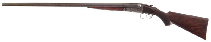 PARKER P GRADE DAMASCUS DOUBLE BARREL SHOTGUN. Cal. 12 ga. SN 64859. Listed in the Parker Gun Identification & Serialization book as a “PT” grade and states that it was a Grade O with plain twist bbls. Built on a No. 1 frame with 30” twist bbls choked IMP-CYL/CYL by gauge, measures FULL/FULL with tapered, concave, matted rib with sgl ivory bead, doll’s head rib extension, extractor & dbl triggers. Mounted with replacement, nicely figured, center burl cut, American walnut with checkered splinter forearm & capped pistol grip stock, 13-5/8” over a Parker dog’s head buttplate. Receiver has light border decorations with foliate arabesque patterns around screws and on fences. This shotgun is in every issue of The Double Gun Journal as an advertisement for the book, The Parker Story. Bore diameter: left – .756, right – .756. Bore restrictions: left – .037, right – .034. Wall thickness: left – .033, right – .033. Drop at heel: 3”, drop at comb: 1-5/8”. Weight: 7 lbs. 5.12 oz. CONDITION: Fine plus. Bbls retain about all of their beautiful, restored, brown twist pattern and receiver retains about 50% faded case colors with balance turned silver. Wood is sound and retains about all of its fine custom finish. Mechanics are fine, bright shiny bores that have been honed. 4-59236 JR530 (4,000-6,000)