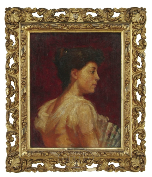 BERT GEER PHILLIPS (American, 1868-1956) PORTRAIT OF A YOUNG WOMAN. Small oil on canvas half portrait shows a side view of a young woman holding a colorful fan in front of her. She wears a yellow dress with white edges and long gold gloves. Signed upper left “Bert Phillips” against the bright red background. Phillips is best known for his Indian subjects and this probably is from an earlier period when he was in Europe. A wonderful portrait by a very accomplished artist. Housed in a fine pierced carved gilt wood period frame. SIZE: 10” x 8”. CONDITION: Surface dirt, would brighten with cleaning. Very good. 9-29165 (2500-4000)