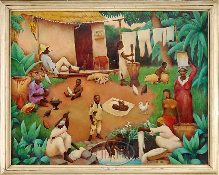 ELLA PHILLMORE LILLIE (American, 1884-1972) “THE FAMILY’S FARM ENTERPRISE”. Large oil on canvas southern scene shows a large family gathered outside their shanty, each involved in some activity. A woman tends to a cooking pot, a man smokes a cigar on the porch, a woman washes clothes, a child riding a pig pulling its tail, a woman beats clothes and livestock are scattered in the scene including pigs and chickens. Signed lower right. Signed and titled on reverse of canvas. Housed in a white painted molded wood frame. A partial label is in corner of stretcher which is illegible. SIZE: 28″ x 36″. CONDITION: Very good. 9-95684 (6,000-8,000)