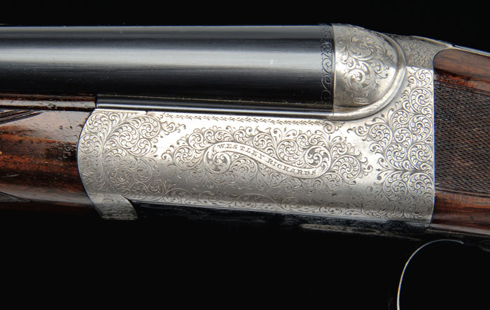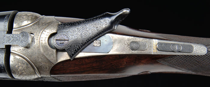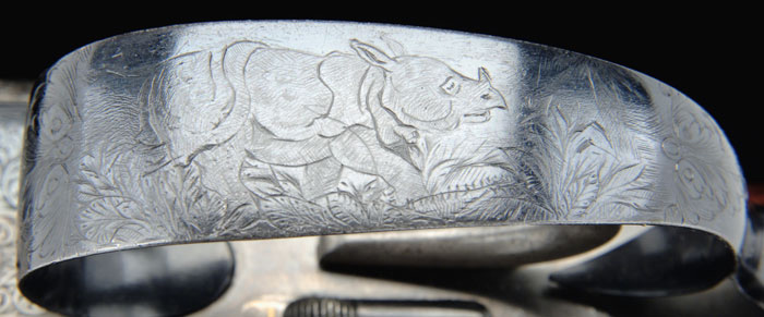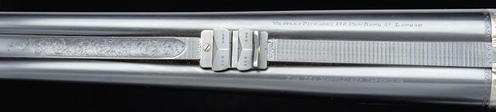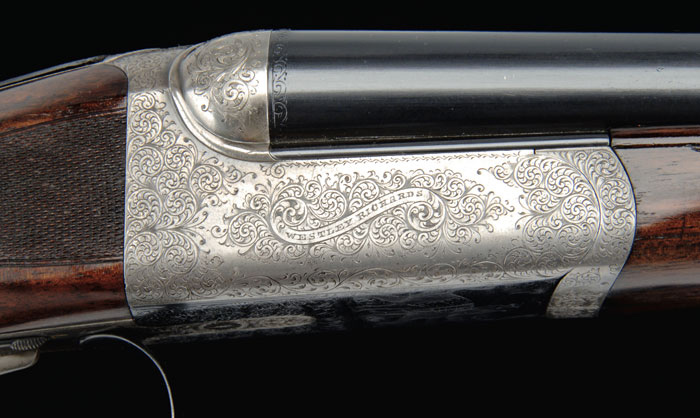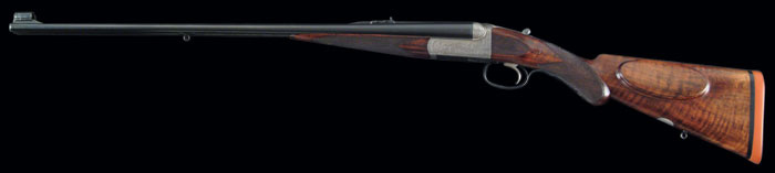*BEST QUALITY WESTLEY RICHARDS DROP ACTION DBL RIFLE. Cal. 6.5 mm Mannlicher Schoenauer. SN 15716. Beautiful box lock dbl rifle, 26-1/16” bbls with ramp front sight with hood, swamped rib, & 3-leaf platinum line express rear sight graduated 100, 150 & 250 yds. Krupp steel bbls. Right bbl has maker’s name & address and left bbl “FOR .256 MANNLICHER CARTRIDGE”. It has doll’s head extension, third bite with dbl lumps, ejectors & sgl selective trigger. Receiver is beautifully engraved with maker’s name on each side with about 80% coverage foliate arabesque patterns. It has Westley Richards’ patented “one” trigger marked on top of frame with the patented Westley Richards thumb lever. Floor plate is engraved in great detail with a bull elephant & mahout and trigger guard with a charging rhinoceros. Appended metal is engraved to match. Top tang has “SAFE” in gold & a tiny rotating stalking safety. Mounted with highly figured, tiger striped, English walnut with checkered splinter forearm & Prince of Wales rnd knob grip with checkered, raised teardrop side panels & cheek piece, 14-1/4” over a solid red pad. It has sling eyes on bbls & bottom of stock and has a blank silver plate on bottom of stock. Accompanied by its orig oak & leather green felt lined trunk case with maker’s label in lid, compartmented in bottom for a square Westley Richards oil bottle, a 2-pc coated metal cleaning rod, three boxes of Kynoch ammunition & three Galazan wood handled turn screws, along with a leather pouch containing cleaning bits. Accompanied by a Westley Richards certificate of authentication fully identifying this rifle and showing completion in 1903 and sold to Mr. V. Flemming of London. Also accompanied by copies of the production ledger giving full specifications for this rifle. CONDITION: Very fine. Bbls retain about all of a fine professionally restored finish & receiver retains case colors in sheltered areas with floor plate & trigger guard retaining most of their orig factory bright blue. Wood is sound with minor handling & use marks and retains about all of a fine professionally restored finish. Mechanics are fine, bright shiny bores with some slight frosting in grooves, may clean better. Case is scuffed & worn on outside and moderately faded & soiled inside but completely sound & good for another 100 years. 4-60726 JR310 (27,500-37,500)