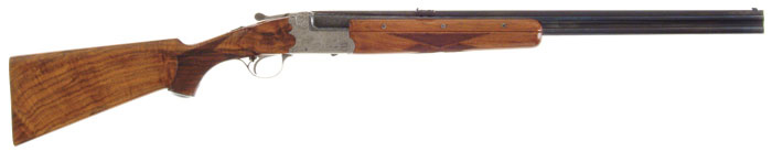*CONTINENTAL ARMS IMPERIAL CROWN GRADE OVER/UNDER DOUBLE RIFLE. Cal. 30-40 Krag. SN 14870. Fine Belgium made double rifle with 25-3/4” superposed bbls with hand matted raised solid rib with partridge type front sight and 3-leaf, 2 folding, 1 standing, express sight with double bbl extensions third bite with double underbite ejectors and single selective trigger. It is mounted with highly figured streaky French walnut with 3-pc checkered field style forearm and pistol grip stock with cheek piece 14” over a smooth butt. Receiver, trigger guard and thumb lever are coin finished and beautifully engraved with large vignettes of two fighting boar on the left side with two sows in the front area and a large stag and hind on the right side with a larger stag on the bottom, all surrounded by fine foliate arabesque patterns. The trigger guard is engraved with a wolf or a fox. The fences, bbl reinforcements and about 3-1/4”” up the bbls are nicely engraved in oak leaf and acorn patterns. The top lever has a raised gold crown with a top tang thumb safety. Drop at comb: 1-9/16”, drop at heel: 2-5/8”. Weight 7 lbs 14.72 oz. CONDITION: Very fine. bbls retain most of an extremely well done restored blue, with slight muzzle edge wear. Receiver and trigger guard retain most of their fine coin finish and the wood is sound, retaining about all of a professionally restored finish. Mechanics are fine. Bright, shiny bores. 4-60730 JR592 (7,500-12,500)