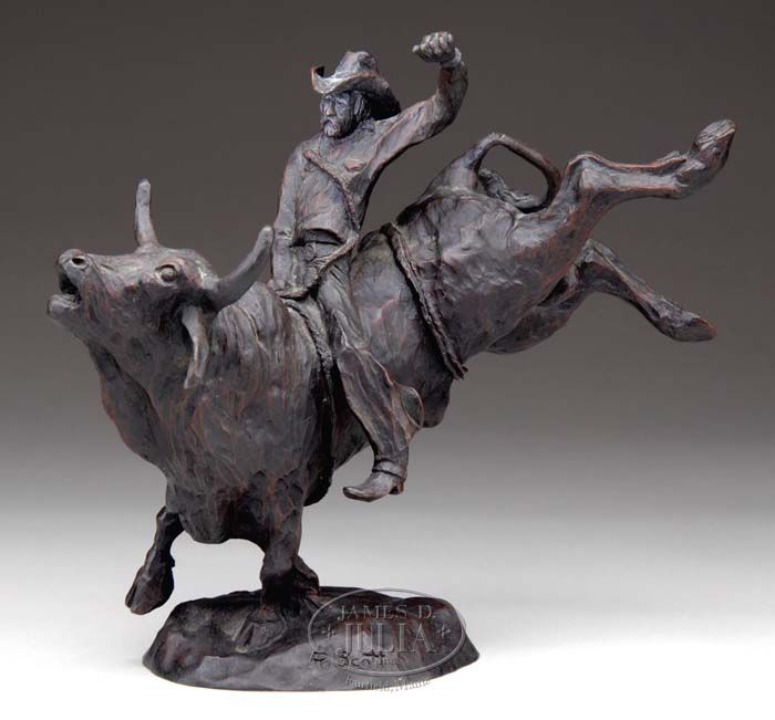 R. SCOTT (Second half of the 20th Century) BRONZE FIGURAL GROUP “THE BULL RIDER”. Depicting a bearded rodeo rider atop a bucking Brahma bull on a natural rocky plinth. The plinth incised: “R. Scott.” In dark brown patina. SIZE: 9-1/4”h x 10-1/4”l x 6-1/4”w. CONDITION: Tail bent and broken near base. 9-90371 SM (800-1,200)