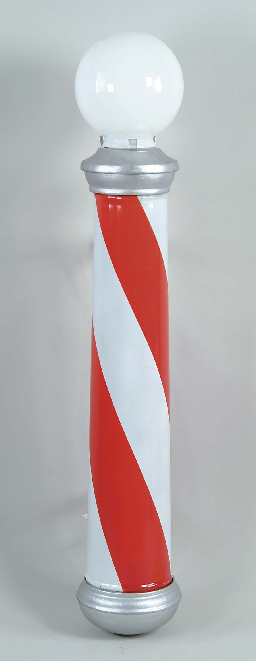 OUTDOOR PORCELAIN BARBER POLE. Early wall mount electrified barber pole with a milk glass globe. SIZE: 42” h. CONDITION: Cast iron surfaces repainted, porcelain in great shape. 1-3625 (550-650) Auction: Advertising, Toy & Doll - Spring 2005 Please Note: All prices include the hammer price plus the buyer’s premium, which is paid by the buyer as part of the purchase price. The prices noted here after the auction are considered unofficial and do not become official until after the 46th day. |