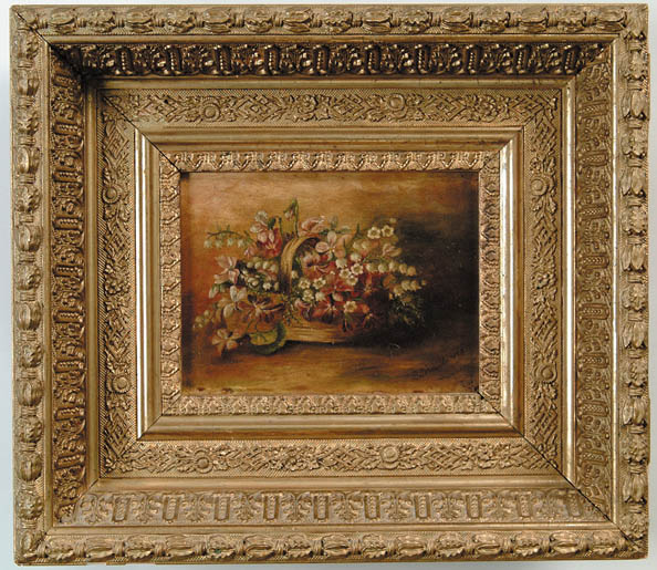 CORIE DAVIS (American, 19th Century) STILL LIFE WITH BASKET OF WILDFLOWERS. Oil on canvas still life shows handled basket with white flowers and green leaves. Flowers appear to be Lilys of the Valley. All on a greenish/brown background. Signed lower right “Corie Davis”. Housed in its original fine gesso decorated gold frame. SIZE: 6-3/4” x 8-1/2”. CONDITION: Very good with a discolored varnish layer. 9-94450 (200-400)