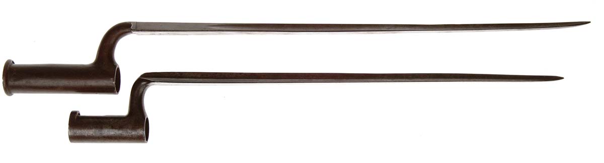 LOT OF TWO EARLY SOCKET BAYONETS. (1) Brown Bess type with 16-1/2″ triangle shaped blade, 1-1/8″ at the widest point, flat on top with hollow ground fullers on the back. It is marked near the shank end “Deakin” with inspector initials “H.S” and the number “8”. It has a short thick shank with 3-15/16″ socket that has a 7/8″ hole without locking ring. It has a reinforced collar at the back edge. CONDITION: Very fine. Light surface spotting, medium to dark brown patina. (2) Late contract 1795 musket bayonet with 15″ triangle shaped blade, flat on the top, with hollow ground fullers on the back. It has a short stiff shank with 2-11/16″ socket that has a 27/32″ hole without lock and has a “G” by the cutout. CONDITION: Fine. Medium brown patina with very fine surface pitting. 4-54321, 4-54322 JR299 (500-700)