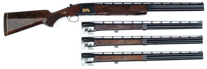 *CASED BROWNING CITORI GRADE SIX 4-BBL SKEET SET. Cal. 12, 20, 28 ga. & 410. SN 16864PT6A3. Blue finish with four sets of 26” bbls with raised, flat, matted ribs, Bradley white ivory front beads & ivory center beads, all choked SKEET/SKEET. Mounted with very nicely figured feather & burl walnut with one checkered target forearm and a flat knob, pistol grip stock, 14-3/8” over its orig Browning waffle pad. It has a wide checkered gold plated trigger. Receiver is nicely engraved with two gold flying pheasant on left side, three gold ducks on right side, a gold setter on bottom & a gold quail on trigger bow, all surrounded with full coverage, foliate arabesque patterns. All appended metal parts are engraved to match. Accompanied by a brown leatherette, brown lined, square corner Browning case. CONDITION: Very fine plus, has been fired. Metal retains most of its orig factory finish with very minor edge wear. Wood is sound with small nicks & scratches, one bruise on left side of buttstock & retains about 97-98% orig high gloss finish. Mechanics are crisp, bright shiny bores. Case is equally fine. 4-59127 JR321 (3,500-5,000)