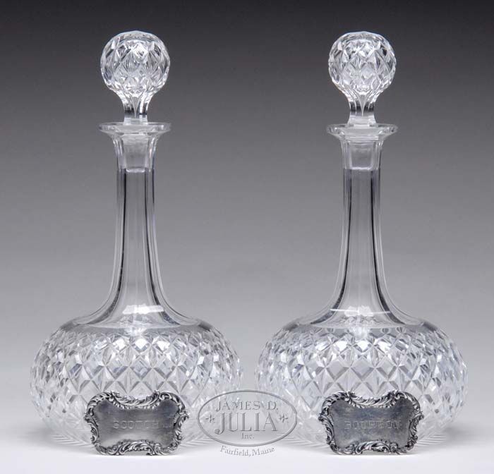 PAIR OF CUT GLASS GOURD-SHAPED LIQUOR BOTTLES WITH STERLING LABELS. Each bottle having its original cut matching stopper, diamond-cut design, fourth quarter of the 19th Century. The leaf scroll-decorated sterling labels, one “Bourbon”, the other “Scotch”. SIZE: 11” total height. CONDITION: Some very light cloudiness to interior. Very good. 9-74268 SM (200-300)