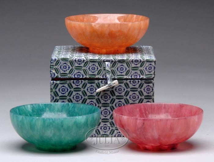 THREE TURNED JADE RICE BOWLS, 20TH CENTURY. One of each in green, reddish-purple, and peach, together with a carrying box. PROVENANCE: Fine private Long Island, New York mansion. SIZE: 4-1/4” dia. CONDITION: Very good. 9-73913 SM (400-600)