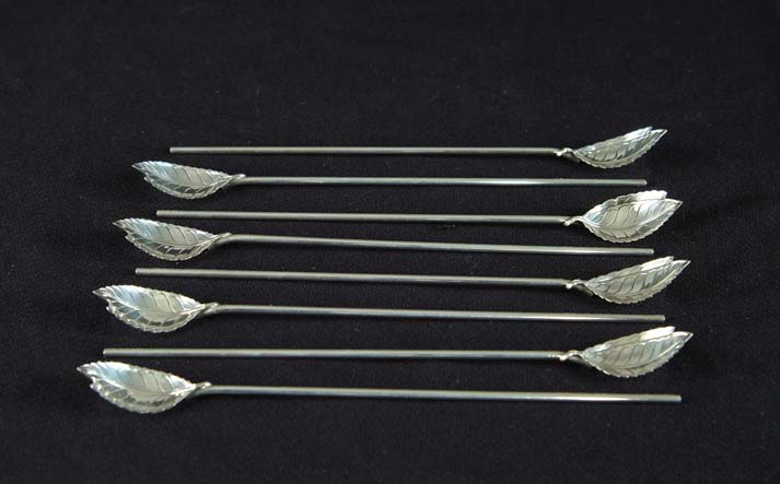 SET OF EIGHT TIFFANY STERLING STRAWS. Marked “Tiffany & Co., Sterling”. Silver tube handle, double leaf bowl. WEIGHT: 3 tr. oz. SIZE: 8-1/2” l. CONDITION: Very good. 12-111 (200-300)