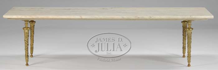 ITALIANATE MARBLE TOP AND BRASS COFFEE TABLE, MID 20TH CENTURY. The rectangular marble top raised on four turned and tapered ribbon-tied cylindrical legs. SIZE: 15-1/2”h x 60”l x 20”d. CONDITION: Overall very nice. 9-90785 SM (600-800)