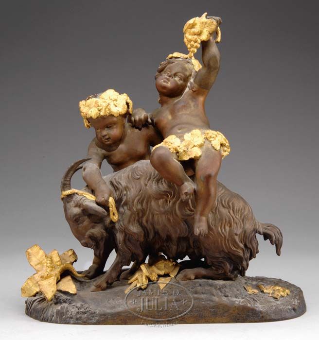 AFTER CLAUDE MICHEL CLODION (French, 1738-1814) TWO PUTTI AND A RAM. Bronze figural group depicting two frolicking putti roping a ram. On an oval plinth having artificially gilt heightened details. SIZE: 16” h x 15” l x 6-1/2” d. CONDITION: Old patina, very good. 5-64979 SM (1,000-2,000)