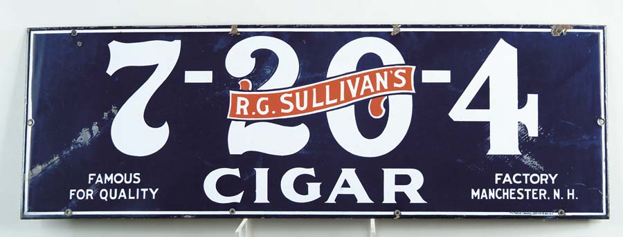 R. G. SULLIVAN’S CIGAR SIGN. Blue version porcelain sign from this Manchester, N.H. factory manufactured by the Baltimore Enamel Co. N.Y. SIZE: 36” w. x 12” h. CONDITION: Generally good with some surface abrasion and chips to grommet holes. PF 1-4454 (150-250) Auction: Advertising, Toy & Doll - Spring 2005 Please Note: All prices include the hammer price plus the buyer’s premium, which is paid by the buyer as part of the purchase price. The prices noted here after the auction are considered unofficial and do not become official until after the 46th day. |